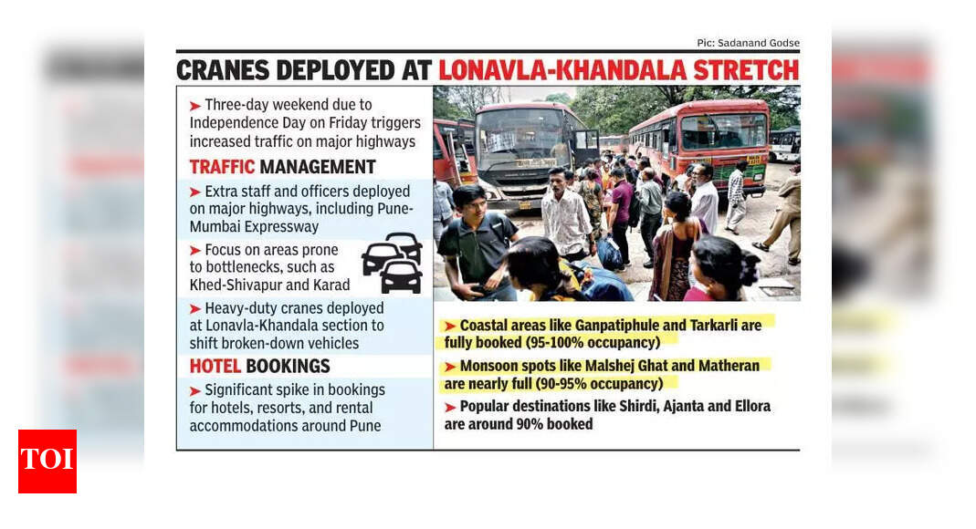 पुणे-शुक्रवारी स्वातंत्र्य दिनासह तीन दिवसांच्या शनिवार व रविवारने प्रवासाची गर्दी वाढविली आहे, महामार्गांवर रहदारी वाढविली आहे आणि हॉटेलच्या बुकिंगला चालना दिली आहे. महामार्ग पोलिसांनी मोठ्या प्रमाणात वाहतुकीचे ठोके रोखण्याच्या उद्देशाने अतिरिक्त कर्मचारी तैनात केले आहेत.गर्दीची अपेक्षा ठेवून उद्योजक प्रतीभिंग यांनी गुरुवारी मुंबईची सहल पुढे आणली, तर अॅडरश नायर यांनीही बंगळुरूच्या सहलीला प्रगती केली आणि शनिवार व रविवार अनागोंदी टाळण्यासाठी गुरुवारी तिकिटे बुक केली. “मी मुंबईत राहणा her ्या माझ्या भावाला भेट देत आहे. सुरुवातीला मी शुक्रवारी लवकर निघून जाण्याची योजना आखली होती, परंतु शुक्रवारी सकाळी वाहतुकीच्या अनागोंदीच्या भीतीने मी गुरुवारी निवड केली,” सिंह म्हणाले.नायर म्हणाले की मार्गावरील बांधकाम कामामुळे त्याने आपली सहल पुढे केली. “याशिवाय शुक्रवारी तिकिटांच्या किंमती जास्त आहेत,” तो म्हणाला.शुक्रवारी भारी वाहतुकीची अपेक्षा करत एसपी विक्रांत देशमुख, हायवे सेफ्टी पेट्रोल, पुणे विभाग, म्हणाले, “आम्ही पुणे-मुंबई एक्सप्रेसवे, पुणे-कोल्हापूर, पुणे-नगर आणि पुणे-नशिक यांच्यासह मुख्य महामार्गावर कर्मचारी व अधिकारी तैनात करू. मार्गे आम्ही ड्रोन किंवा इतर तंत्रज्ञान वापरण्याऐवजी रहदारी व्यवस्थापित करण्यासाठी मनुष्यबळावर अवलंबून आहोत.“देशमुख म्हणाले की, ब्रेकडाउनच्या बाबतीत वाहने बदलण्यासाठी लोनावला-कौंडला विभागात काही भारी कर्तव्य क्रेन तैनात करण्यात आल्या आहेत. ते म्हणाले, “उरसे टोल प्लाझा आणि घाट विभागातील आमचे कार्यसंघ जड वाहन चालकांना त्यांच्या हालचालींसाठी फक्त डाव्या लेन वापरण्यास सांगतील. जड वाहनांना मध्यम व उजव्या लेनवर प्रवास करण्याची परवानगी दिली जाणार नाही,” तो म्हणाला.हे व्यावसायिक आणि बॅनरचे रहिवासी शान्तानू राऊत यांनी सर्व इंटरसिटी गाड्या पूर्णपणे बुक केल्यावर आढळल्यानंतर लांब शनिवार व रविवारसाठी मुंबईतील मित्रांना भेट देण्याची आपली योजना बदलली. ते म्हणाले, “पुणे-मुंबई एक्सप्रेस वे वर संभाव्य रहदारीच्या जामविषयी चिंता असूनही मी गुरुवारी संध्याकाळी निघून जाण्याऐवजी माझ्या मित्राने सुचवले.”महामार्गांना जोडणार्या शहरातील रस्त्यांकडे रहदारी व्यवस्थापित करण्यासाठी आणि गर्दी रोखण्यासाठी पोलिसांची महत्त्वपूर्ण उपस्थिती देखील असेल. पुणे येथील अतिरिक्त पोलिस आयुक्त मनोज पाटील यांनी सांगितले की, जवळजवळ सर्व रहदारी पोलिस अधिका of ्यांची पाने रद्द केली गेली आहेत. “रहदारी व्यवस्थापित करण्यासाठी सिंघाद रोड, सातारा रोड आणि नगर रोड या पुण्यातील मुख्य मार्गांवर अतिरिक्त कर्मचारी तैनात करण्यात आले आहे