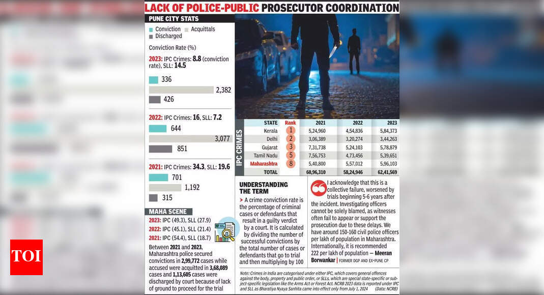 पुणे: महाराष्ट्रात गुन्हेगारीच्या शिक्षेच्या दरामध्ये स्थिर सुधारणा दिसून येताच, 2021 ते 2023 दरम्यान 20 लाखाहून अधिक लोकसंख्या असलेल्या 19 महानगरांपैकी पुणे सातत्याने क्रमांकावर आहे, राष्ट्रीय गुन्हे रेकॉर्ड ब्युरो (एनसीआरबी) च्या वार्षिक अहवालात 2023 च्या वार्षिक अहवालात असे दिसून आले आहे.२०२23 मध्ये, पुणे यांनी भारतीय दंड संहिता (आयपीसी) गुन्हेगारीसाठी सर्वात कमी दोषी ठरवला, सर्व १ met मेट्रोसमध्ये फक्त 8.8%आणि दुसर्‍या सर्वात कमी गुन्ह्यांसाठी विशेष आणि स्थानिक कायदे (एसएलएल) नगपूरच्या पुढे 14.5%वर. एनसीआरबीच्या आकडेवारीवरून असे दिसून आले आहे की २०२१ ते २०२ between दरम्यान पुणे पोलिसांनी १,681१ प्रकरणांमध्ये दोषी ठरवले, तर ,, 651१ प्रकरणे निर्दोष ठरली आणि १,591१ खटल्याच्या अपुरी कारणांमुळे डिस्चार्ज झाला.याउलट, २०२23 मधील महाराष्ट्राचा एकूण दोषारोप दर आयपीसी प्रकरणांसाठी .3 .3..3% आणि एसएलएल गुन्ह्यांसाठी २.9..9% होता, जो २०२२ मध्ये अनुक्रमे .1 45.१% आणि २१..4% पासून सुधारित झाला. तज्ज्ञांनी सांगितले की पुणे शहरातील दोषी दरातील घट विशेषत: शहराच्या तुलनेने कमी गुन्हेगारीचा दर 7 337.१ च्या तुलनेत आहे, जो राष्ट्रीय सरासरी 448.3 आणि राज्य सरासरी 470.4 च्या खाली होता. 94%च्या दरासह पुणे चार्जशीट दाखल करताना पहिल्या तीन मेट्रोमध्येही स्थान मिळविले.चार्जशीट्सची उच्च फाइलिंग आणि कमकुवत दृढतेच्या परिणामांमधील अगदी भिन्नतेमुळे कायदेशीर आणि पोलिसिंग तज्ञांमध्ये लाल झेंडे वाढले आहेत.२०२24 मध्येही या घटनेचा कलच चालूच राहिला, पुणे पोलिसांनी केवळ २ 1 १ प्रकरणांमध्ये दोषी ठरवले, तर १,4477 च्या परिणामी निर्दोष सुटके झाली, असे पुणे पोलिसांच्या आकडेवारीनुसार या वर्षाच्या सुरूवातीस दिसून आले. तज्ञांनी कमकुवत पुरावा सादरीकरण, कोर्टाच्या निर्णयाचे अपुरी विश्लेषण आणि सरकारी वकिलांशी कमकुवत समन्वयाचे श्रेय कमी केले. माजी डीजीपी आणि माजी पुणे पोलिस आयुक्त जयंत उमरानीकर यांनी टीओआयला सांगितले की आयुक्त किंवा एसपीएस सारख्या वरिष्ठ अधिका officers ्यांनी दोषी ठरविल्या नसलेल्या प्रकरणांमध्ये कोर्टाच्या निर्णयाचा आढावा घेणे ही सामान्य पद्धत आहे. ते म्हणाले, “यामुळे शोध घेणा leas ्या चुकांची ओळख पटली आणि त्यांची पुनरावृत्ती रोखण्यात मदत झाली. ही प्रथा आता कमी झाली आहे,” ते म्हणाले.पोलिसांच्या नियंत्रणाबाहेर ते कोर्टाचे अधिकारी म्हणून स्वतंत्रपणे कार्यरत असल्याचे सांगून उमरनीकर यांनी सरकारी वकिलांमध्ये उत्तरदायित्वाची कमतरता दर्शविली. “पूर्वी ते पोलिस वकील म्हणून ओळखले जात असत आणि विभागाचा भाग होता. आता त्यांना सरकारी वकील म्हणून नियुक्त केले गेले आहे आणि स्वतंत्रपणे कार्य केले गेले आहे,” ते म्हणाले.माजी डीजीपी 