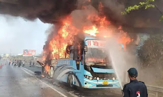 मिळालेल्या माहितीनुसार, टायर फुटल्याने बसने अचानक पेट घेतला. अपघात झाला त्यावेळी बसमध्ये अनेक प्रवासी होते. बसने अचानक पेट घेतल्याने अनेक प्रवाशांचा जीव धोक्यात आला होता. चालकाने प्रसंगावधान दाखवत सर्व प्रवाश्यांना सुखरूप खाली उतरवलं. त्यामुळे कोणत्याही प्रवाशाला दुखापत झाली नाही आहे, सर्व प्रवासी सुखरुप आहे. आगीवर अग्निशमन दल आणि यंत्रणेने नियंत्रण मिळवले आहे.