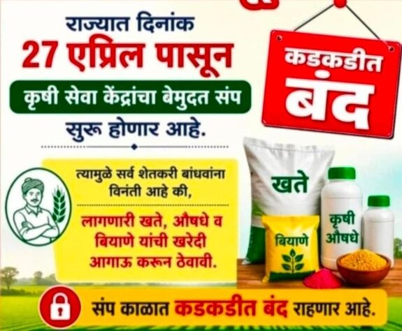 जळगाव (प्रतिनिधी विनोद पवार) : राज्यातील कृषी क्षेत्रात मोठी खळबळ उडवणारा निर्णय घेत, महाराष्ट्र फर्टिलायझर्स, पेस्टिसाईड्स, सीड्स डीलर्स असोसिएशन यांनी राज्यभरात बेमुदत बंद आंदोलन पुकारले आहे. दि. १७ एप्रिल २०२५ पासून सुरू झालेल्या या आंदोलनामुळे राज्यातील सर्व कृषी सेवा केंद्रे पूर्णतः बंद ठेवण्यात आली असून, बियाणे, खते आणि कीटकनाशकांची विक्री पूर्णपणे ठप्प झाली आहे.