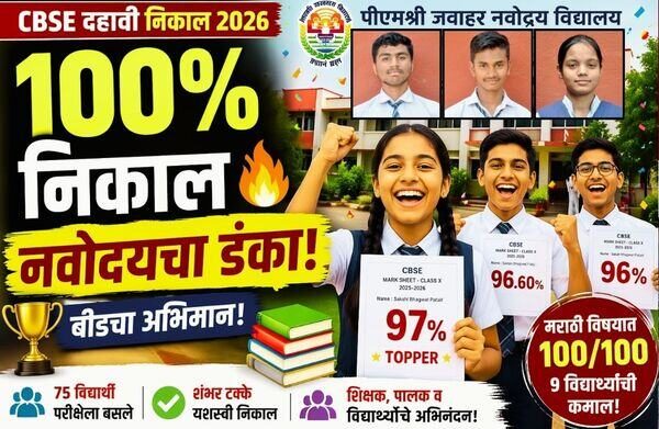 गेवराई  (प्रतिनिधी विष्णू गायकवाड) : केंद्रीय माध्यमिक शिक्षण मंडळाच्या (CBSE) शैक्षणिक सत्र 2025–26 चा दहावीचा निकाल जाहीर होताच बीड जिल्ह्यातील गढी (शिवाजीनगर) येथील पीएमश्री जवाहर नवोदय विद्यालयाने पुन्हा एकदा आपल्या गुणवत्तेचा ठसा उमटवला आहे. विद्यालयाचा निकाल शंभर टक्के लागला असून विद्यार्थ्यांनी उल्लेखनीय यश संपादन करत पुणे विभागात उत्कृष्टतेची परंपरा कायम राखली आहे.