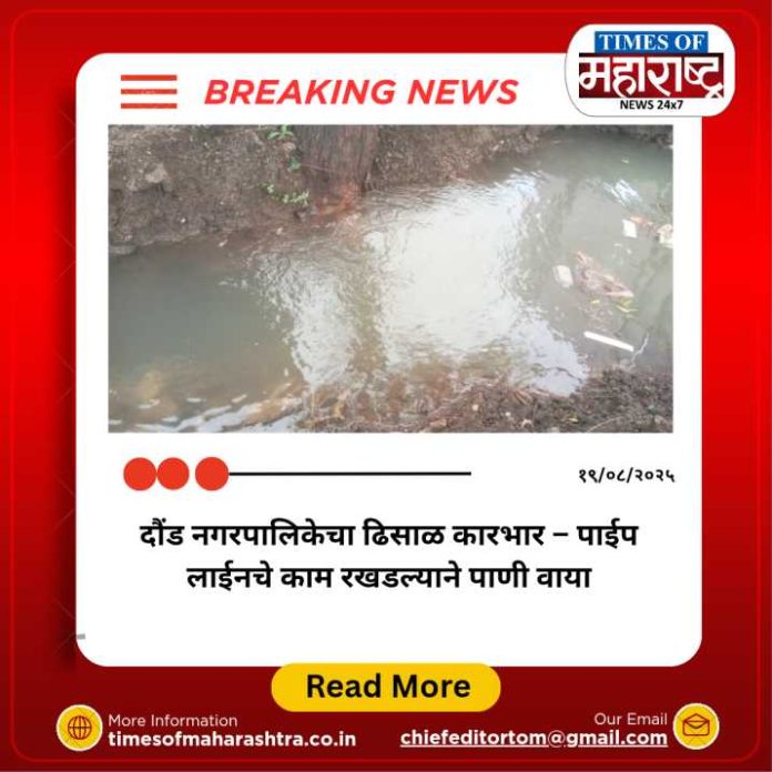 दौंड शहरातील प्रभाग क्रमांक १० मधील मेन रोडलगत पाईप लाईनचे काम मागील १५ ते २० दिवसांपासून रखडलेले आहे. या कामाच्या अर्धवट अवस्थेमुळे मोठ्या प्रमाणावर पाणी वाहून जात असून नागरिकांना मोठ्या गैरसोयींचा सामना करावा लागत आहे. शुद्ध पाण्याचा अपव्यय होत असतानाच परिसरात पाणी साचून गलिच्छपणा व दुर्गंधी निर्माण झाली आहे. यामुळे डासांचा प्रादुर्भाव वाढून साथरोग पसरू शकतो, अशी भीती व्यक्त केली जात आहे.