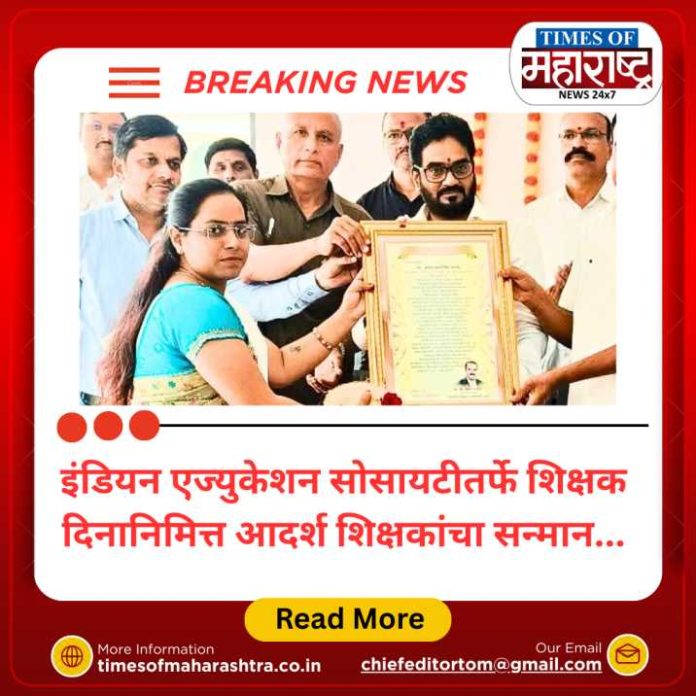 पुणे (टाईम्स ऑफ महाराष्ट्र नॅशनल न्युज चॅनेल):- इंडियन एज्युकेशन सोसायटीतर्फे शिक्षक दिन २०२५ चे औचित्य साधून मराठी व इंग्लिश माध्यमातील शिक्षकांचा सन्मान करण्यात आला. मराठी विभागातून श्री खांबे सर तर इंग्लिश विभागातून आशा म्हस्के यांना आदर्श शिक्षक म्हणून आमदार योगेश टिळेकर यांच्या हस्ते गौरविण्यात आले.