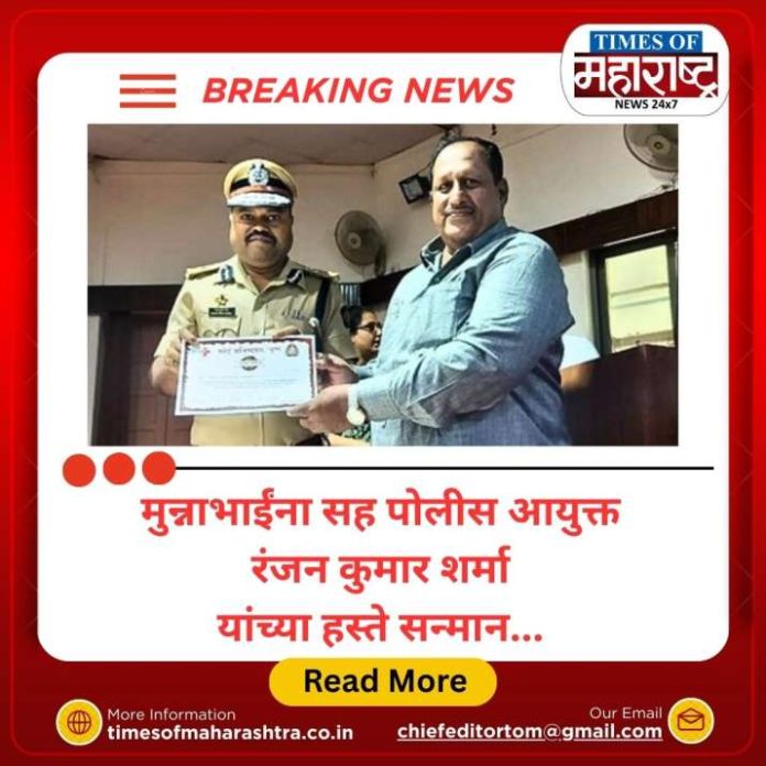 मुन्नाभाईंना सह पोलीस आयुक्त रंजन कुमार शर्मा यांच्या हस्ते सन्मान…