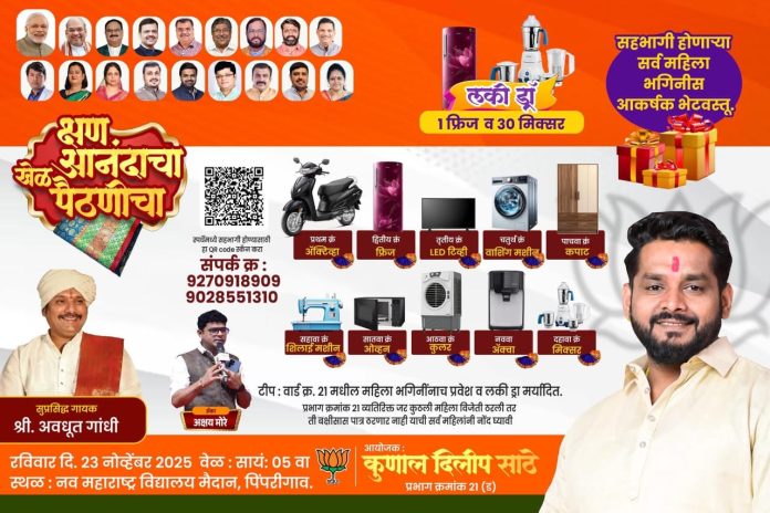 गणेश नारंग, पिंपरी चिंचवड प्रतिनिधी: पिंपरी चिंचवड महानगरपालिका प्रभाग क्रमांक २१ मधील महिलांसाठी एक मोठी सांस्कृतिक मेजवानी आयोजित करण्यात आली आहे. समाजकार्यात सक्रिय असलेल्या कुणाल दिलीप साठे यांच्या वतीने रविवार, २३ नोव्हेंबर २०२५ रोजी पिंपरीगावात खेळ रंगला पैठणीचा हा विशेष मेगा-इव्हेंट आयोजित केला जाणार आहे. विविध उपक्रमांच्या माध्यमातून महिलांचा सामाजिक सहभाग वाढविण्यावर भर देणाऱ्या या कार्यक्रमाबद्दल प्रभाग २१ (पिंपरीगाव, वैभवनगर, मिलिंदनगर) मधील महिलांमध्ये प्रचंड उत्सुकता निर्माण झाली आहे.