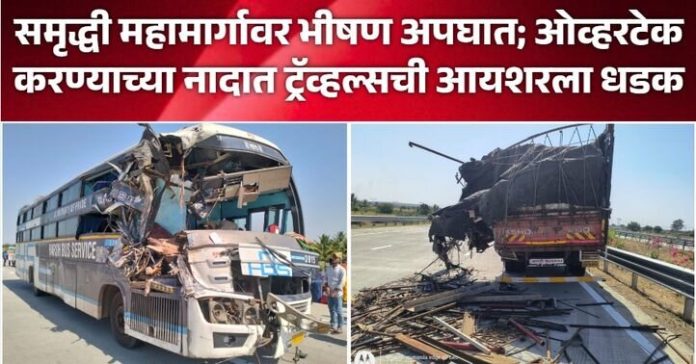 मिळालेल्या माहितीनुसार, नागपूर कॉरिडॉरवरील चॅनल क्रमांक ३७७.४ जवळ ‘हर्ष ट्रॅव्हल्स’ (क्र. AR 11 C 0306) ही बस समोरून जाणाऱ्या आयशर टेम्पोला (क्र. MH 03 CV 3101) ओव्हरटेक करत होती. मात्र, यावेळी चालकाचे वाहनावरील नियंत्रण सुटल्याने बसने टेम्पोला मागून जोरात धडक दिली. या धडकेत ट्रॅव्हल्सच्या समोरील भागाचे मोठे नुकसान झाले.